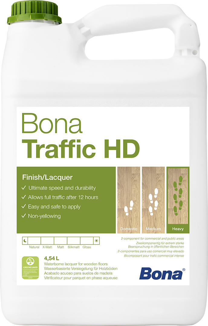 Bona Traffic HD is the world’s toughest and fastest drying lacquer. It allows for full traffic to be resumed just 12 hours after application, and was developed for application on large surfaces. Used in hotels, restaurants and airports worldwide, where short downtime is essential, it is a wood floor lacquer perfected.