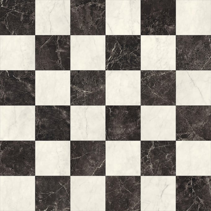 Bring opulence to a classic checkerboard floor with beautifully veined marble-effect tiles in a timeless pairing of clean, crisp white and deep, dramatic black.