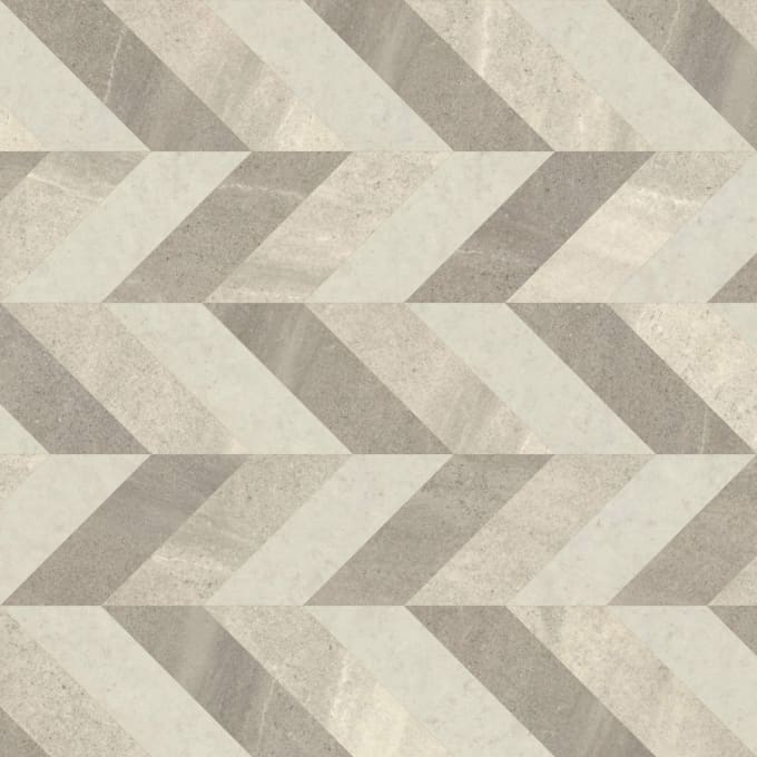 A contemporary canvas of neutral stones perfectly complements Pleat’s angular geometry.